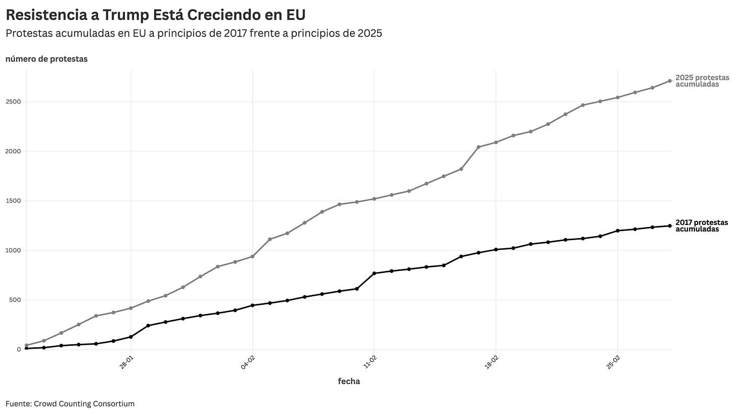 En los primeros 40 días de Trump en la Casa Blanca, se registraron 2 mil 710 protestas, un promedio de 67 al día - más del doble de las que ocurrieron durante los primeros 40 días del primer periodo de Trump. Ese número se incrementa diario, con acciones que incluyen marchas, mítines y actos de desobediencia civil. Por ejemplo, se multiplican acciones de ocupación y grafiteo de concesionarias de Tesla, la empresa de autos de Elon Musk, el socio de Trump y el hombre más rico del planeta.